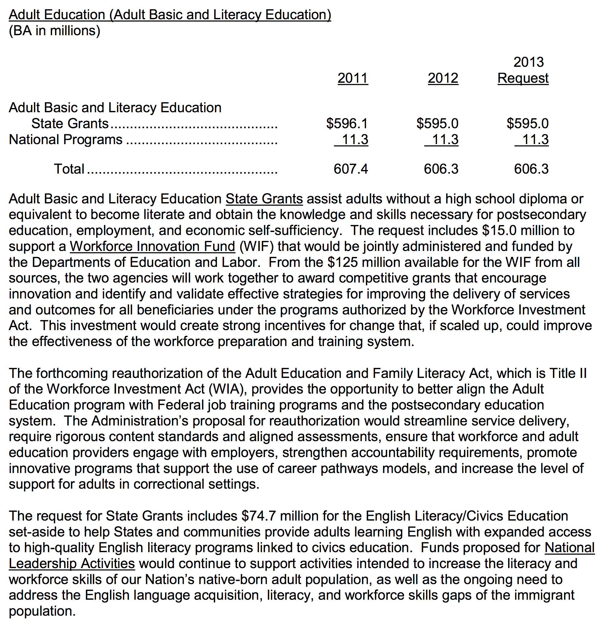 Yesterday the President unveiled his budget proposal for fiscal year 2013. To no one’s surprise, the President proposed level funding for adult education. This doesn’t mean that this will be the actual federal budget for adult education in 2013—most people who follow the budget process agree that there is no chance the President’s proposed budget will be adopted by Congress. As Derek Thompson notes at The Atlantic, “[T]he vast majority of its provisions are dead-on-arrival.” Still, it’s a good sign that a reduction in adult education spending is not being proposed here. As we know from last year’s FY 2011 budget debate, Congress is likely to go along with almost any proposed reductions in non-military spending. (It’s also important to remember that there are other smaller sources of federal funding for adult education services in other parts of the budget, which I haven’t looked at yet.)