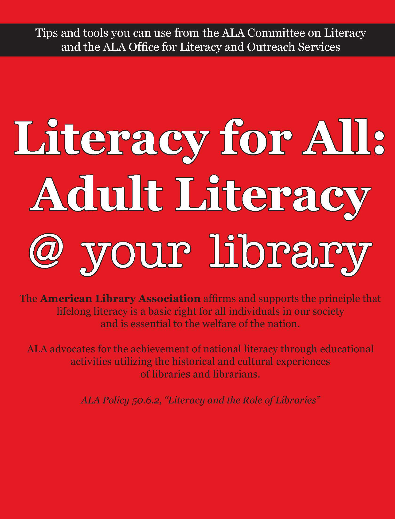 According to ALA , Literacy for All “features tips and tools for assessing community adult literacy needs and tailoring a literacy plan to address those needs, as well as examples of successful and replicable library literacy plans and resources for serving adult new and non-readers.”