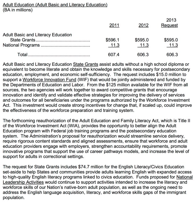 While the President’s proposed FY 2013 budget will continue to be the focus of attention in Washington this week, the most urgent adult education funding battles over the next year are more likely to occur at the state and district level, I think—most notably. Today, for example, the Los Angeles Unified School District Board has scheduled a vote on a proposal to cut most of the $200 million in state money earmarked for adult education in the district.